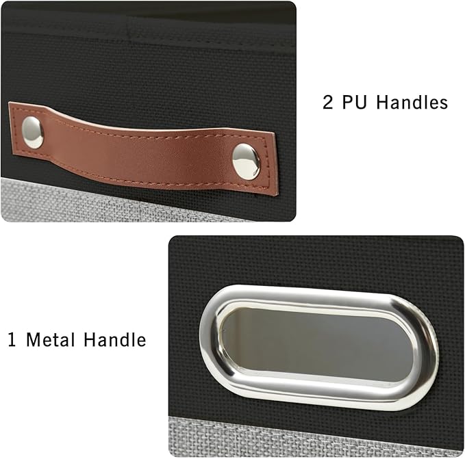Large Collapsible Fabric Storage Bins with 3 Handles, Foldable Organizer Baskets for Closet, Shelves, Living Room | 3 Pack, Durable PU & Metal Handles (17"x11.8"x11.8", Black & Gray)