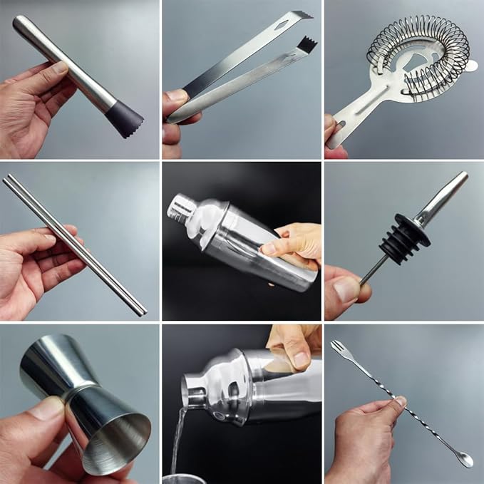 - Bartender Kit included: 1*750ml(25oz) shaker, 1*muddler, 1*15/30ml(0.5/1oz)jigger, 1* ice tongs, 1* ice strainer, 1* fork&spoon, 4 *drinking straw, 4 * Pourer, 1* cocktail Recipes, 1*black stand.