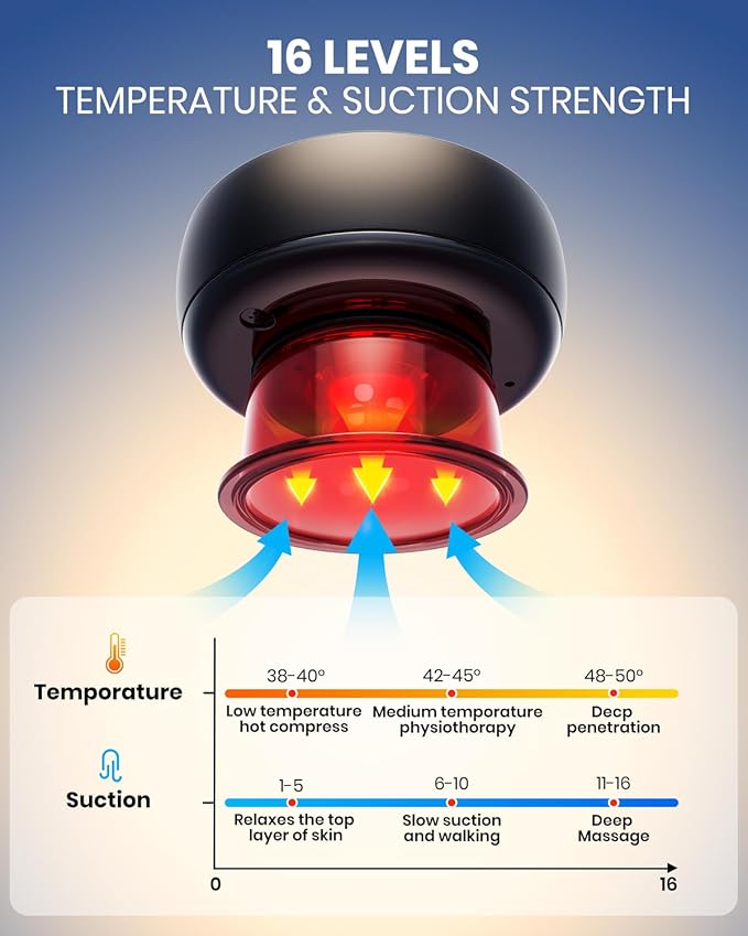 - [Therapy That Adapts to You] This cupping therapy set features 16 levels of suction and 16 levels of heat, plus deep and soothing modes. Whether you need gentle care or deep muscle stimulation, it delivers tailored relief across body areas. Tip: Start at level 1 if you're new.
