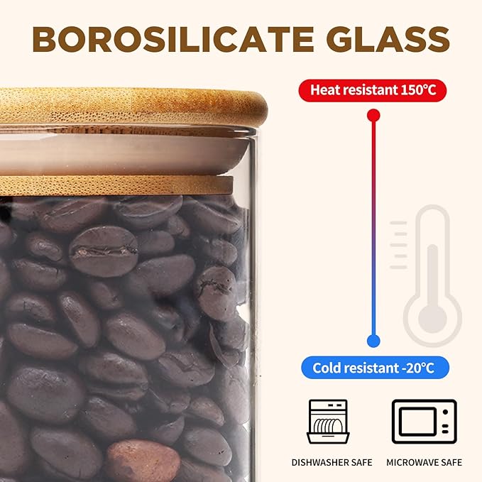 - [Premium quality and safety assurance] Our glass containers with bamboo lids are made of premium quality and borosilicate glass, glass pantry storage containers can withstand the harsh tests of daily use. The bamboo lid provides an airtight seal, ensuring the freshness of stored food. Our glass food storage jars are BPA Free, Phthalate Free, PVC Free, Lead Free, They are healthy and reliable choice for your kitchen.