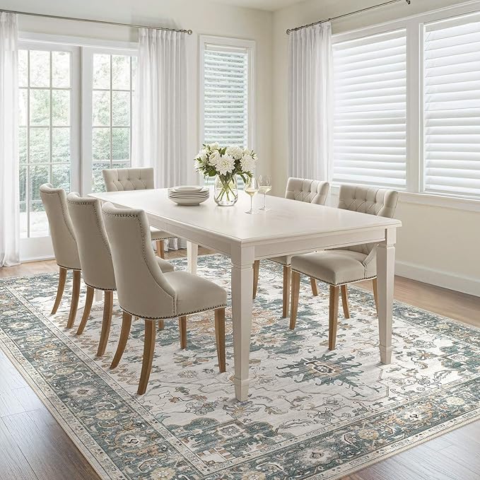 Washable Area Rugs for Living Room - 7x9 Neutral Vintage Distressed Floral Farmhouse Boho Large Soft Floor Rug Indoor Non Slip Carpet for Living Room Bedroom Dining Room Office - Green/Grey