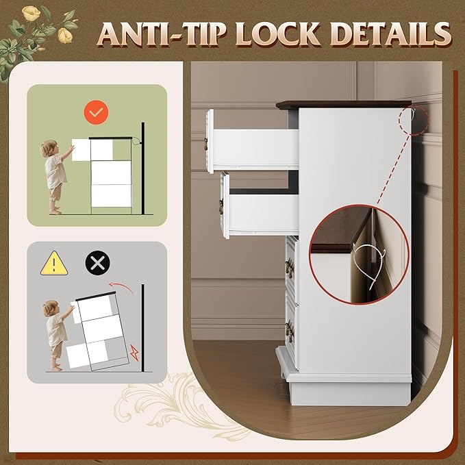 - 🏡【Safe and Sturdy】The dressers & chests of drawers are made of durable engineered wood, featuring a thick tabletop that can support heavy items. Sloping edges and widened legs improve stability. An anti-tipping device ensures child safety by preventing wobbling and tipping.