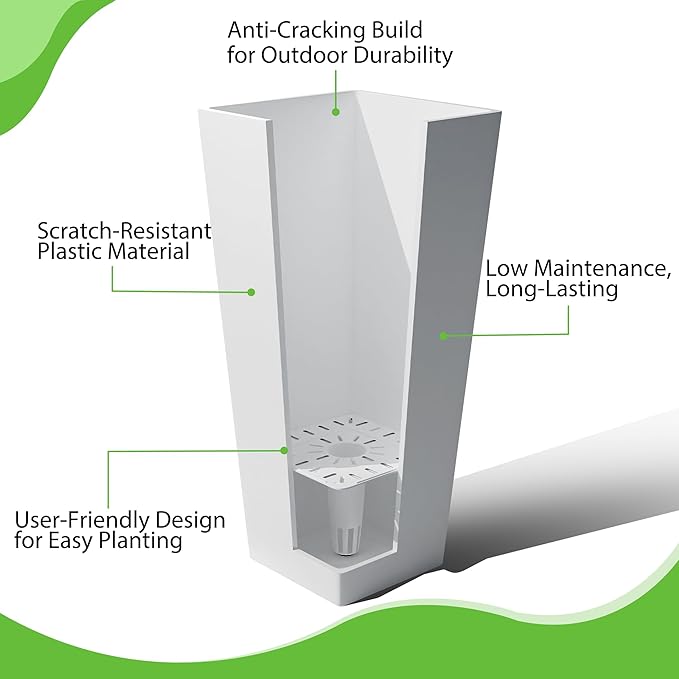 - Built to Endure All Weather Conditions: Crafted from premium, weather-resistant plastic, these tall planters for outdoor plants are designed to resist cracking, fading, and damage from the sun, rain, and snow. Perfect for any season, these large planters for outdoor plants ensure long-lasting durability, making them an excellent choice for outdoor and indoor gardening alike.