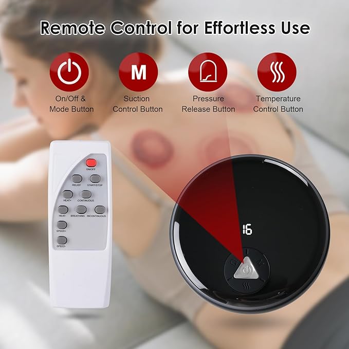 - 【Remote Control for Effortless Use】Our cupping kit for massage therapy features a convenient remote control, making it easy to operate solo. Touch a button, drift into relief – electric cupping delivers warm, muscle-melting therapy anywhere your body craves care.