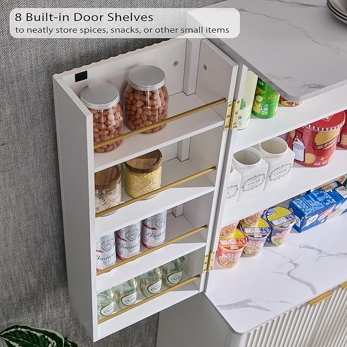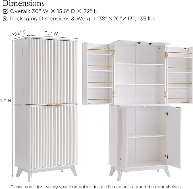- 【Maximize Space with Dual-Zone Storage】Organize effortlessly! 8 adjustable door shelves (ideal for spices/jars) + 2 customizable upper shelves (fits 12" tall items). Lower cabinet’s 15.6"D adjustable shelf holds bulk appliances. Compact 30"W footprint saves space, yet offers 72"H vertical storage—declutter without compromising style.