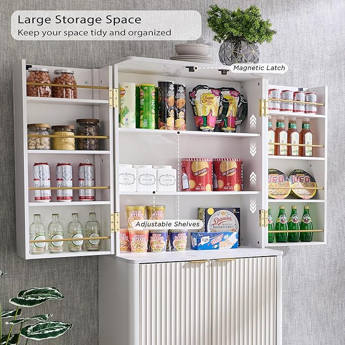 OKD Fluted Kitchen Pantry, 72" Tall Mid Century Modern Storage Cabinet with Adjustable Shelves & Door Organizer, Wood Cabinet for Kitchen, Living Room, Solid White
