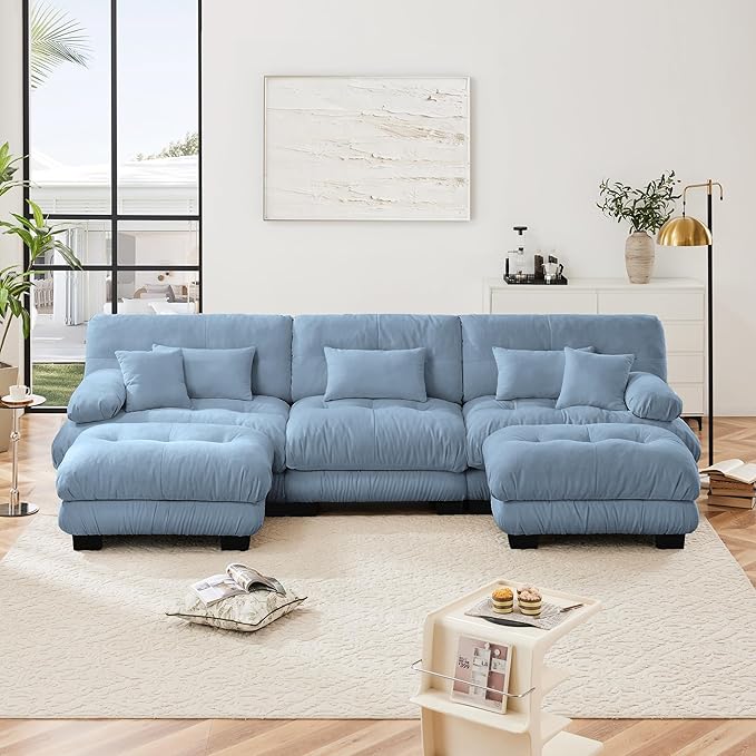 Modular Sectional Sofa, Comfy Cloud Couch 3 Seater Couch with Ottoman, Sectional Couches for Living Room, Modern Chenille U Shaped Couches, Sleeper Deep Seat Sofa with Throw Pillows, Blue