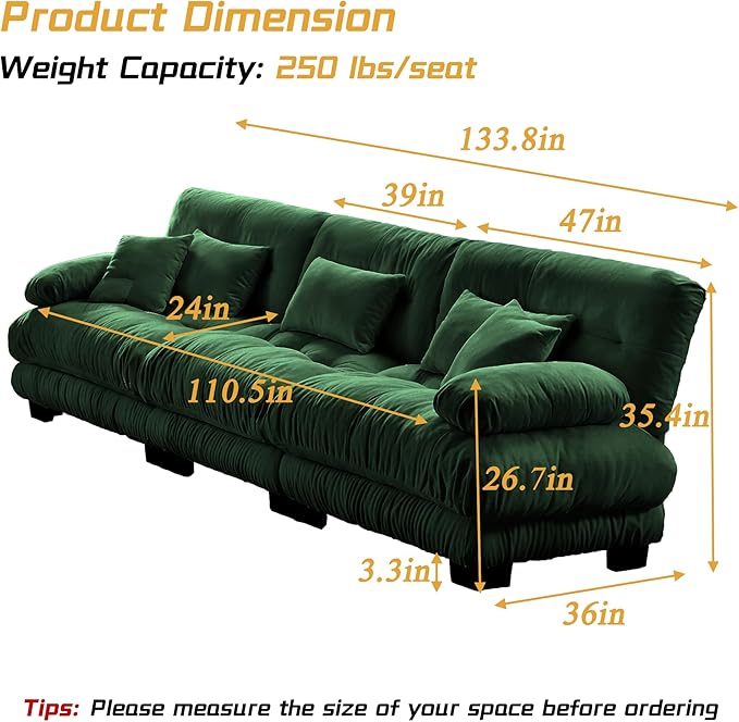 Modular Sectional Sofa, Comfy Cloud Couch 3 Seater Couch, Sectional Couches for Living Room, Modern Chenille Oversized Couches for Bedroom, Sleeper Deep Seat Sofa with Throw Pillows, Green