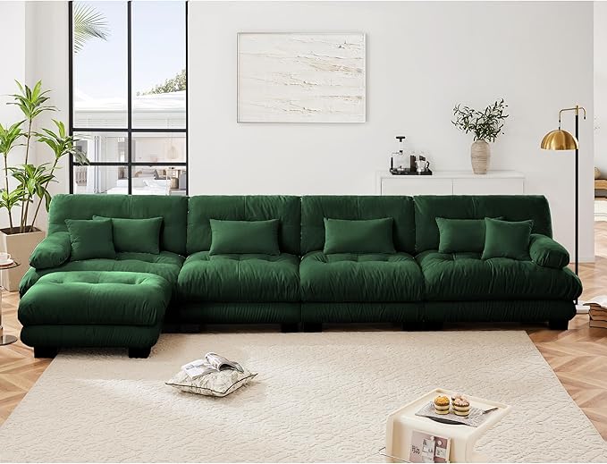 Modular Sectional Sofa, Comfy Cloud Couch 4 Seater Couch with Ottoman, Sectional Couches for Living Room, Modern Chenille L Shaped Couches, Sleeper Deep Seat Sofa with Throw Pillows, Green