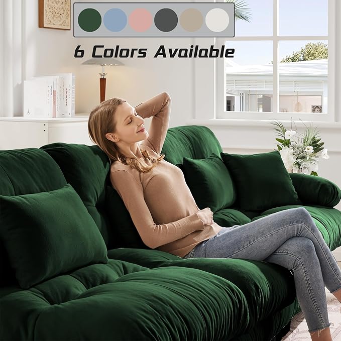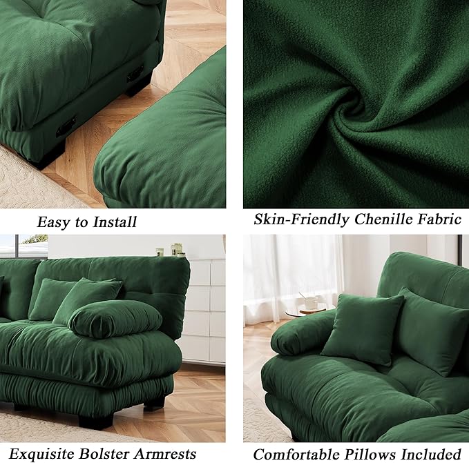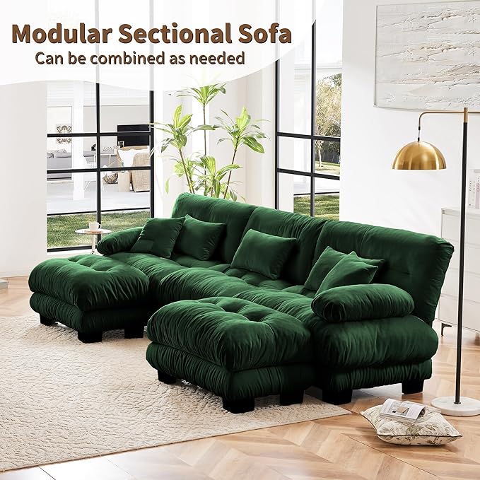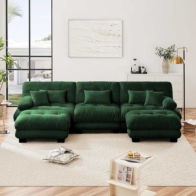 Modular Sectional Sofa, Comfy Cloud Couch 3 Seater Couch with Ottoman, Sectional Couches for Living Room, Modern Chenille U Shaped Couches, Sleeper Deep Seat Sofa with Throw Pillows, Green