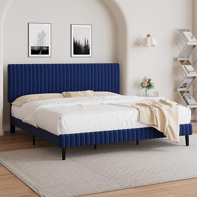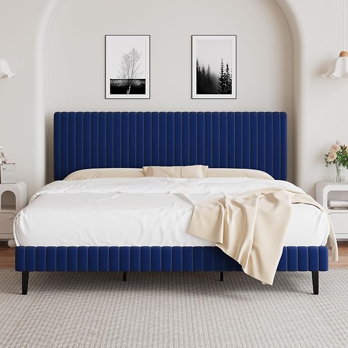 King Size Bed Frame and Headboard, Velvet Upholstered Platform Bed with Vertical Channel Tufted Headboard and Footboard, No Box Spring Required, Easy Assembly, Blue