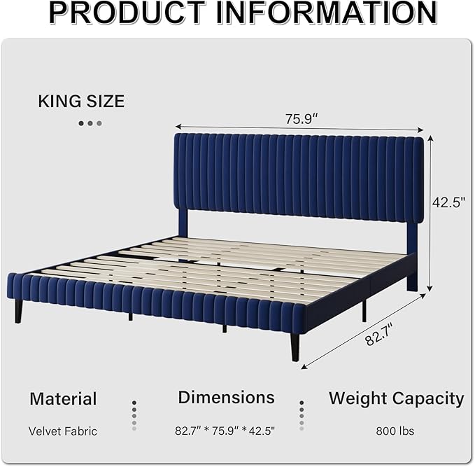 - Spacious and Comfy—The king platform bed frame is wrapped in high-grade velvet fabric, which is comfortable to touch, and the 10.6-inch high platform design makes it easy to get in and out of bed