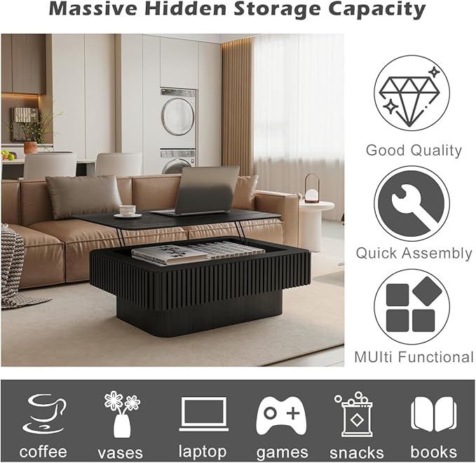 Lift Top Coffee Table with Storage, Solid Wood Coffee Table with Adjustable Height, Fluted Center Table Accent Tea Table for Living Room, Apartment, Office (38.6" Black)
