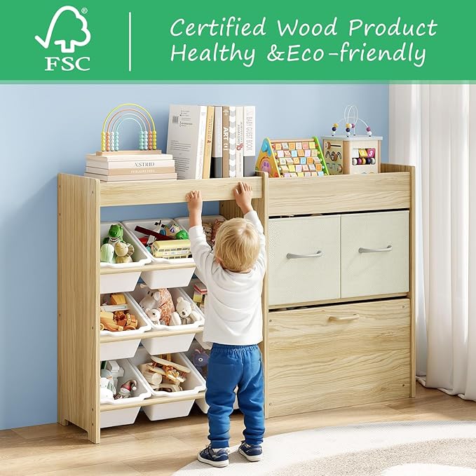 - Solid Pine Wood:Unlike other melamine MDF toy storage organizers that are prone to problems such as unpleasant odors, warping and harming children,our toy shelf is made of natural solid pine wood and features a paint-free design, completely avoiding these issues, making it safer, stronger and more reassuring.
