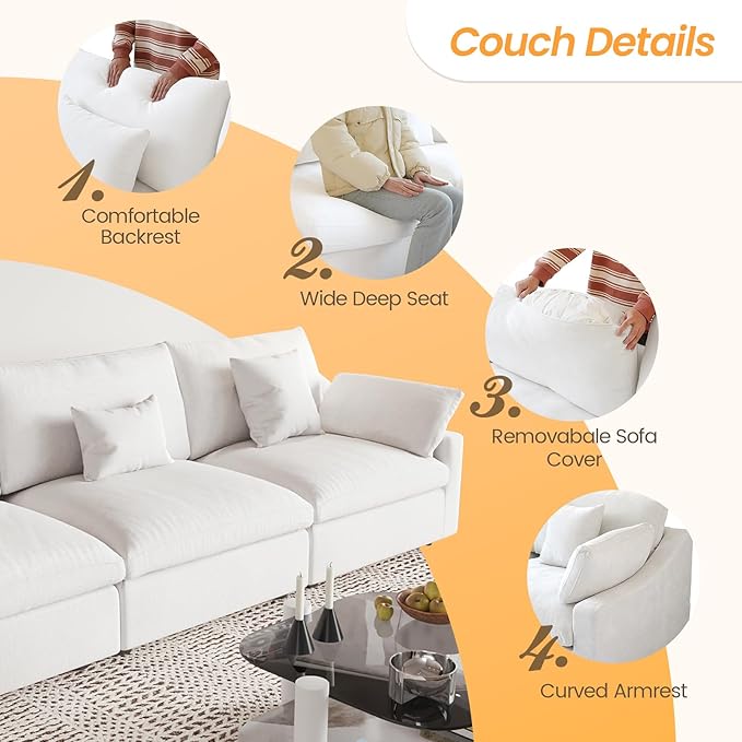 JACH Sectional Couches for Living Room, 3 Seater Cloud Sectional Couch with Deep Seat, Down Filled Modular Sofa, Covers Removeable & Washable, Sofas Furniture for Living Room, White