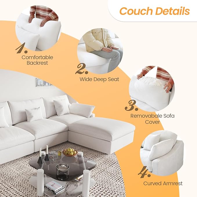 JACH U-Shaped Sectional Couches for Living Room, Cloud Sectional Couch with Deep Seat, 155.9" Modular Sofa with Chaise, Covers Removeable & Washable, Sofas Furniture for Living Room, White