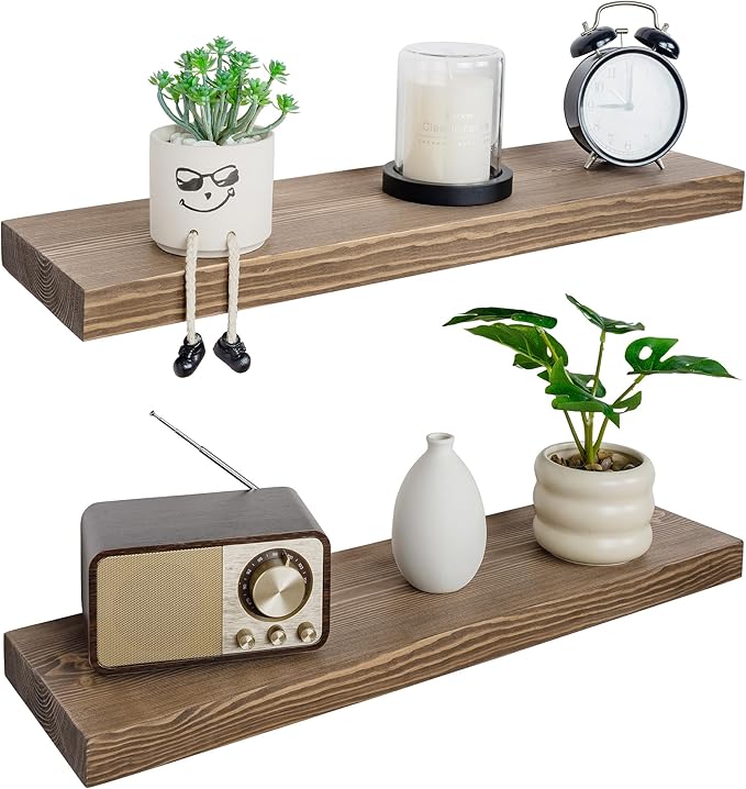 - Solid Wooden Floating Shelves:Crafted by hand from real pine, each 30 inch floating shelf shows off unique wood knots and is stained to create a warm, rustic look that feels right at home