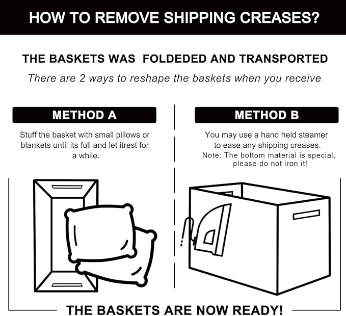 - NOTE: The toy basket is folded, but it will turn back to its elegant shape quickly if you fill it with some towels or blankets, and iron is great idea to remove the creases