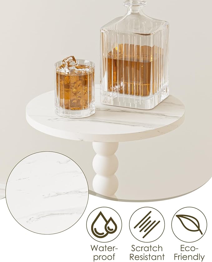 Masupu Round Side Table, Small Drink Table for Small Spaces, Pedestal End Table with Solid Wood Leg for Living Room, Bedroom, Corners(Marble White)
