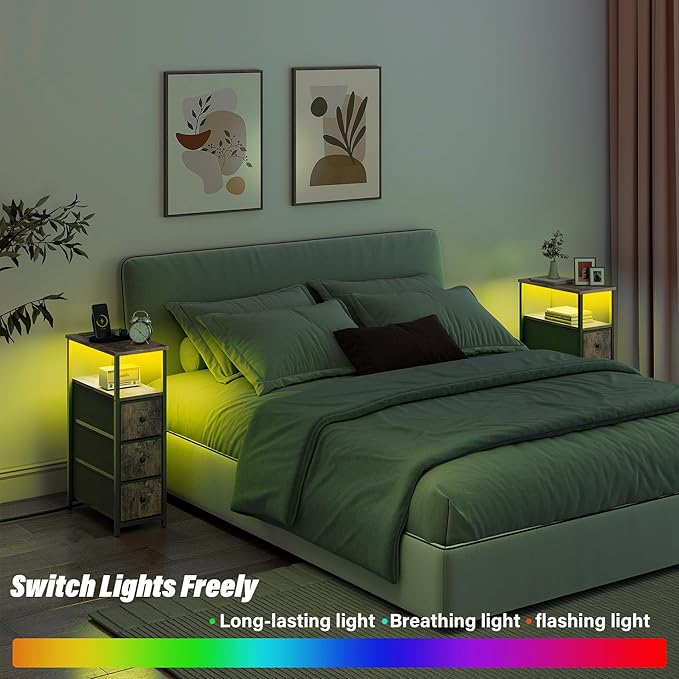 TUTOTAK Narrow LED Night Stand with Charging Station, Slim End Table with Plugins, Tall Side Table with 3 Fabric Drawer, Small Bedside Table with Storage, for Living Room, Brown TB01BB086L