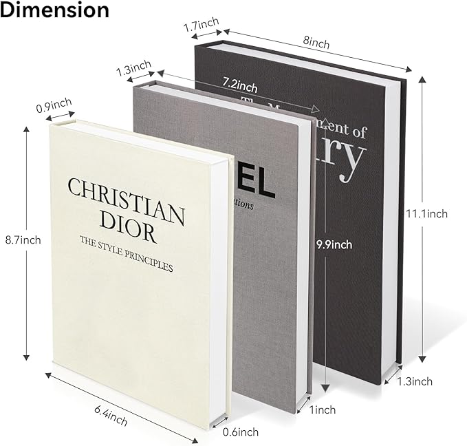 - Three Different Sizes: This cute decorative book set includes 3 books of different sizes, namely: 11.1 * 8.0 * 1.7; 9.9 * 7.2 * 1.3; 8.7 * 6.4 * 0.9;adding realism and fashion to your decor, making it eye-catching on any bookshelf, table, or office decoration