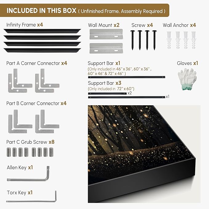 - Assembly Required: The artwork comes with the frame components unassembled. Don’t worry — setup is straightforward and tool-friendly. For best results and accurate alignment, we recommend two people to ensure a smooth assembly and a stable, secure wall mount.