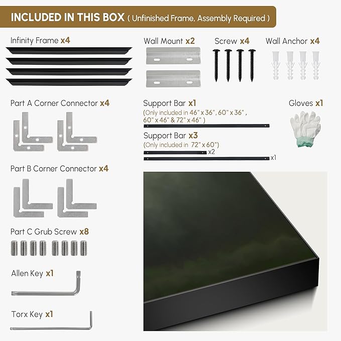 - Assembly Required: The artwork comes with the frame components unassembled. Don’t worry — setup is straightforward and tool-friendly. For best results and accurate alignment, we recommend two people to ensure a smooth assembly and a stable, secure wall mount.