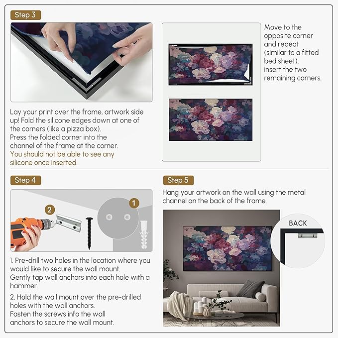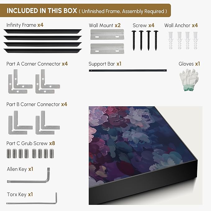 - Assembly Required: The artwork comes with the frame components unassembled. Don’t worry — setup is straightforward and tool-friendly. For best results and accurate alignment, we recommend two people to ensure a smooth assembly and a stable, secure wall mount.