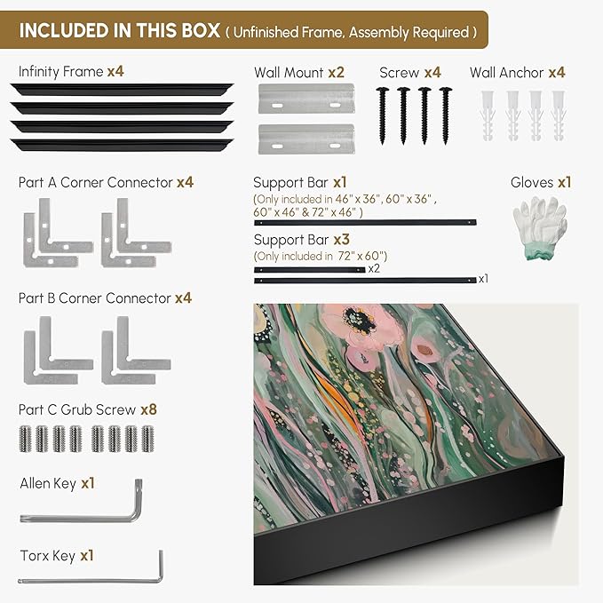 - Assembly Required: The artwork comes with the frame components unassembled. Don’t worry — setup is straightforward and tool-friendly. For best results and accurate alignment, we recommend two people to ensure a smooth assembly and a stable, secure wall mount.