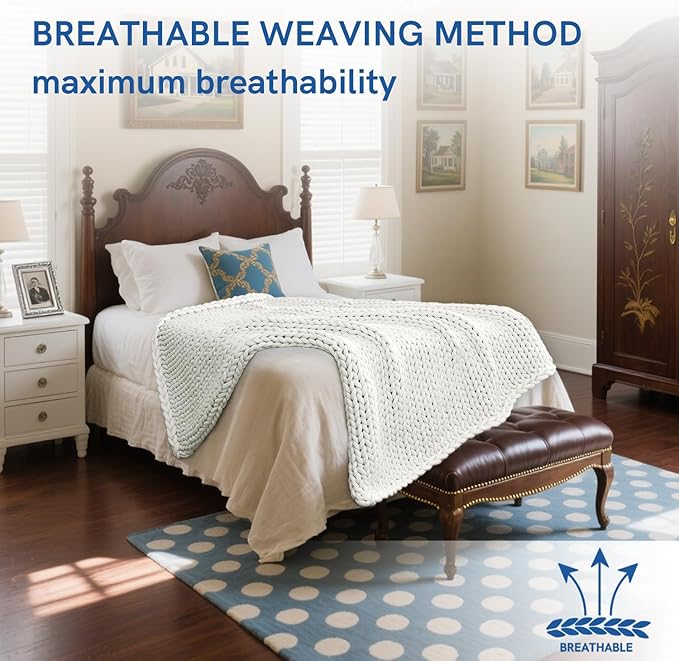 - [Comfortable] This blanket is knitted with a medium weight chunky yarn and matches the YNM Weighted Blanket's embracing and cuddly sensation. Therefore, it is cozy, pleasant, and portable. Whether it's a sofa or a bed, indoors or outdoors, camping or traveling, it can follow you peacefully through all four seasons. Additionally, it is a terrific friend for your pet while you are not present. It is safe and does not shed during usage