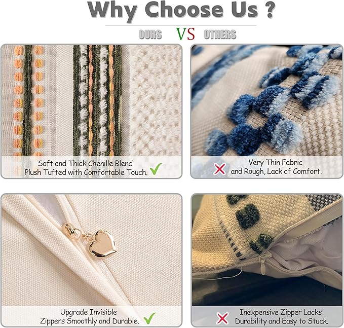 - PREMIUM QUALITY FABRIC: Made from a high-quality chenille and woven polyester blend, the throw pillow covers are ultra-soft and durable. The tufted design adds texture and dimension, creating a luxurious and inviting atmosphere.