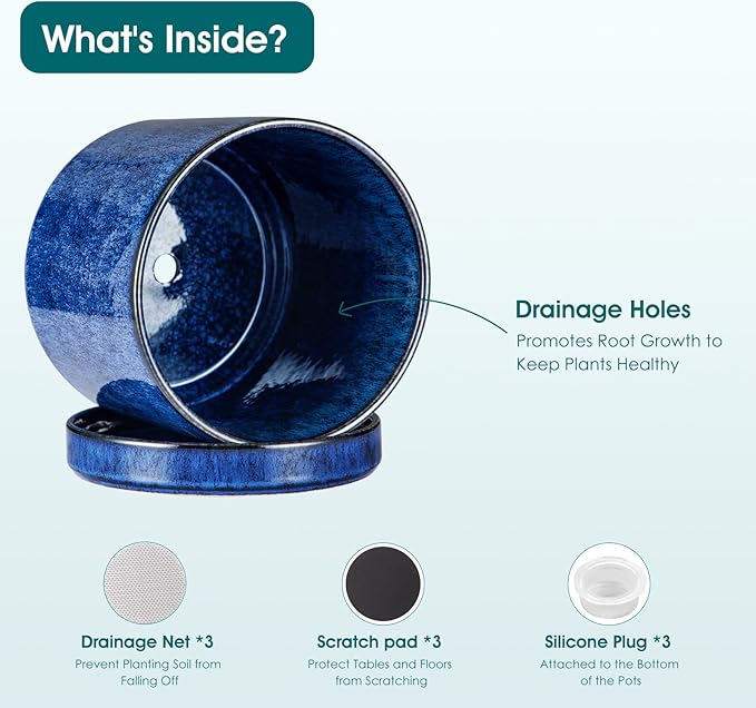 - 【Drainage Holes and Trays】This plant pots indoor with drainage paired with leak-proof mesh pads to efficiently remove excess water, prevent soil loss, and avoid waterlogging. The tray collects drained moisture, keeping surfaces dry, while the design promotes healthy root growth—ideal for flowers, pothos, monstera, africa violet, snake plant ,money tree and small tree sapling, etc (Note: Tray is attached to the bottom; plant is not included.)