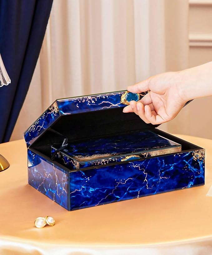 - Premium Quality Decorative Box Set: This set includes two beautifully crafted decorative boxes. The outer frames are made of luxury glass material, while the inner linings are soft velvet, ensuring durability and a luxurious feel. The large box measures 11.10×7.44×4.02 inches, and the small one is 8.35×5.08×2.83 inches. Ideal for storage, organization, or as a stylish keepsake, these boxes are a must-have for any home