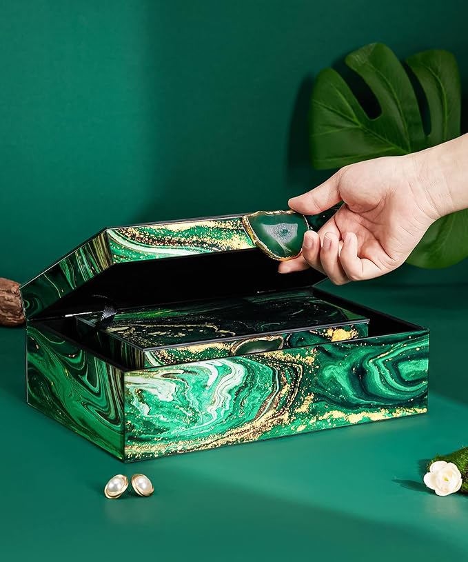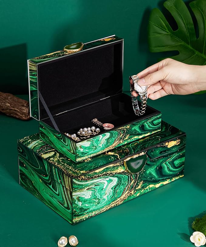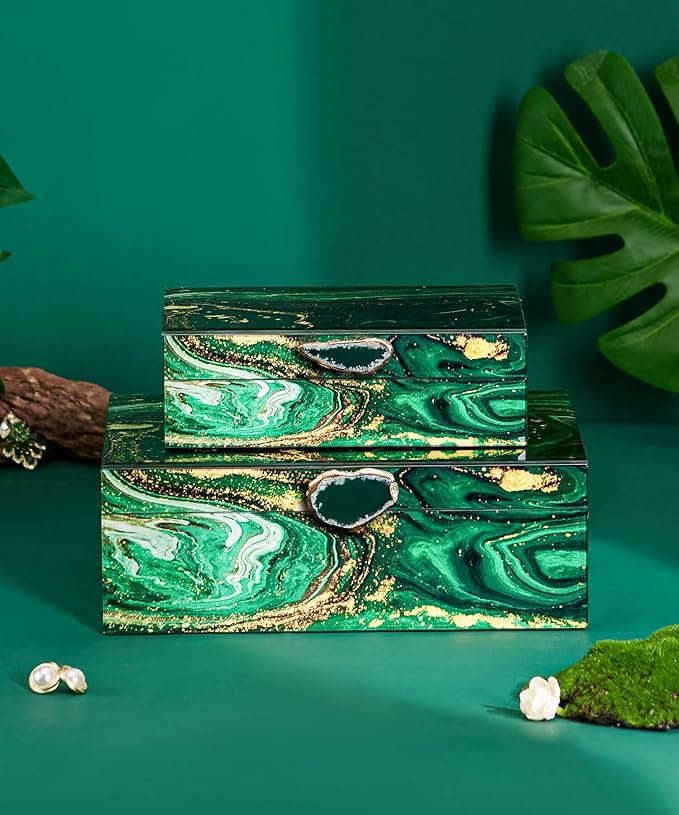 - Stunning Decorative Boxes: These decorative boxes are not just storage containers; they are works of art. The harmonious blend of green and gold on the outer frame creates a vibrant forest-like landscape, enhanced by unique stone handles. A perfect fit for modern home decor, these boxes will add a touch of elegance to any room