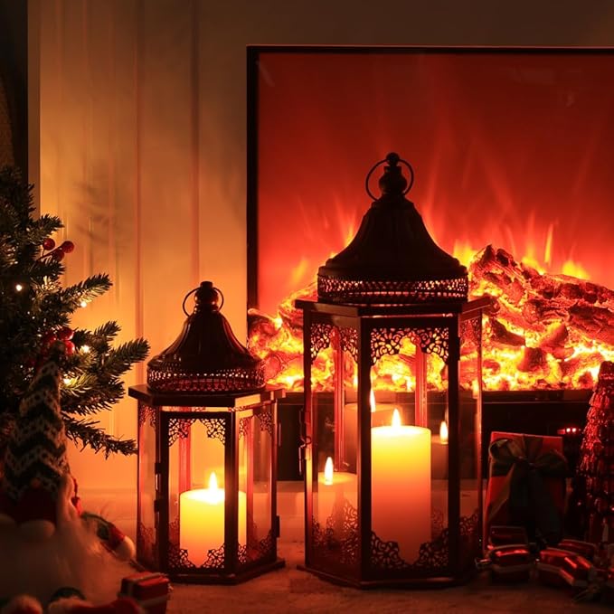 - 【Safe, Windproof & Endlessly Creative】-Featuring six transparent glass panels on each lantern, the design shelters the flame from wind and rain, allowing for the safe use of real flame candles indoors or out(Caution: Top gets hot when lit). For a modern twist, the spacious interior invites you to DIY with Led candles, festive ornaments, or pine cones to create your own unique display.