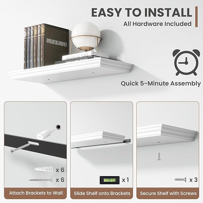 - Multi-Purpose Floating Shelves for Wall: Upgrade any space with these retro, sleek white shelves! Perfect as shelves for the room wall, book shelf for the wall, living Room, office, bedroom, bathroom, or kitchen shelves