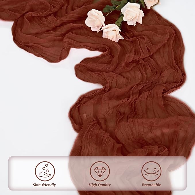 - Cheesecloth Table Runner Size: You will receive 6 terracotta cheesecloth tablerunner, each measuring 20 x 120 inches. The quantity is sufficient for you to decorate various romantic occasions. It can decorate most shaped tables, such as rectangular tables, round tables, and cocktail tables. It is long enough to decorate a large table and be placed perfectly and elegantly on the tabletop, adding a romantic atmosphere to your occasion.