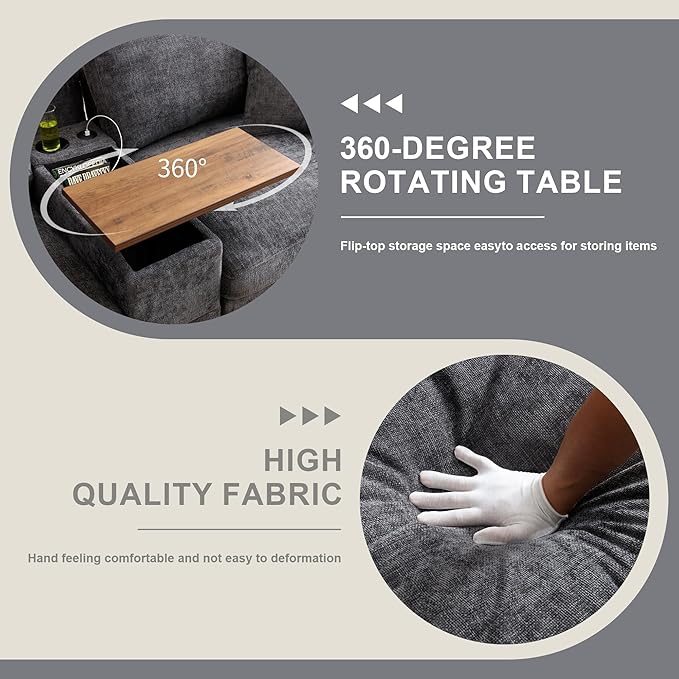 120.3" Modern L-Shaped Sectional Sofa with 360°Swivel Drop-Down Table, Storage Armrest, USB Ports & Movable Storage Ottoman – Plush Linen Cloud Couch for Lounge (Grey)