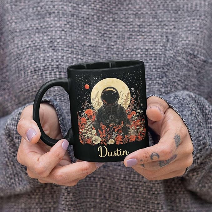 - Uniquely Personalized: Explore the cosmos with this Personalized Astronaut Mug featuring a dreamy moon and wildflowers design. Add a custom name to make it a special gift for friends who love space and nature. A unique astronomy-themed black ceramic cup, ideal for birthdays or everyday wonder. Click "Customize Now" to create your one-of-a-kind celestial mug!