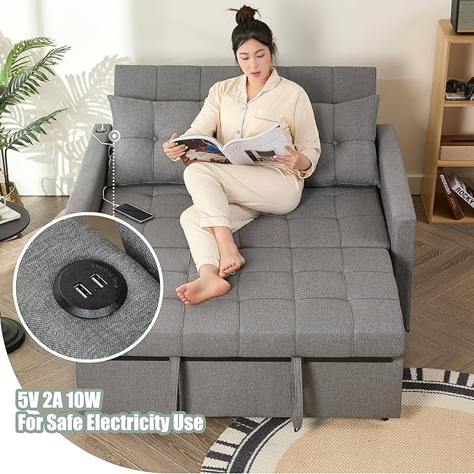 - Premium Material: This Convertible Sofa Bed is built with a sturdy steel frame, providing exceptional support and long-lasting durability. And it has undergone rigorous testing before leaving the factory—its key components are proven to withstand over 10,000 uses. Equipped with USB ports on the side (5V/2A, 10W), this sleeper sofa allows for safe and reliable device charging, making it perfect for everyday use.