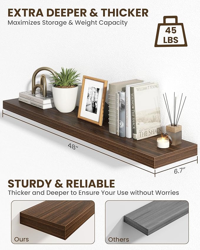 Marsmiles 48" Floating Shelves for Wall, Wooden Shelves with Invisible Brackets Set of 2, Rustic Farmhouse Wall Mounted Shelf for Kitchen Bathroom Living Room Study, Walnut