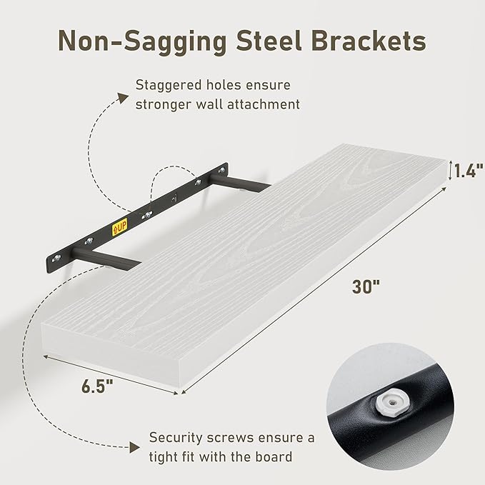 - 30 Inch Floating Shelves for Wall (Set of 3): Each wall shelves are 6.7 inches in depth and 1.4 inches in thickness. 3-piece set is more cost-effective and practical. Our wall shelf can be used in combination, staggered high or low on the wall, or mounted side-by-side to provide extra storage space for organizing small items and clutter in multiple areas such as kitchens, bathrooms, and bedrooms, creating a clean and smooth look. Multiple colors available