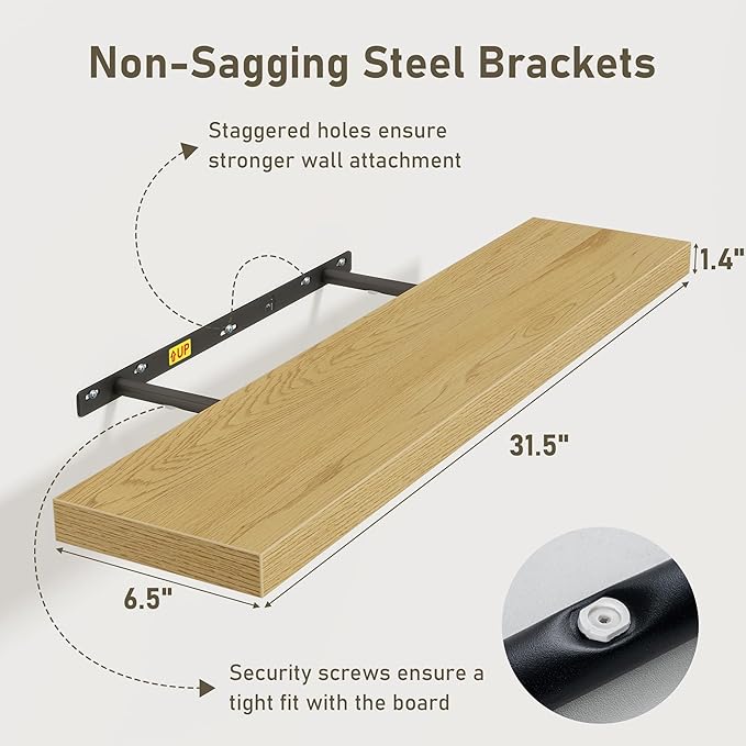- 32 Inch Floating Shelves for Wall (Set of 3): Each wall shelves are 6.7 inches in depth and 1.4 inches in thickness. 3-piece set is more cost-effective and practical. Our wall shelf can be used in combination, staggered high or low on the wall, or mounted side-by-side to provide extra storage space for organizing small items and clutter in multiple areas such as kitchens, bathrooms, and bedrooms, creating a clean and smooth look. Multiple colors available