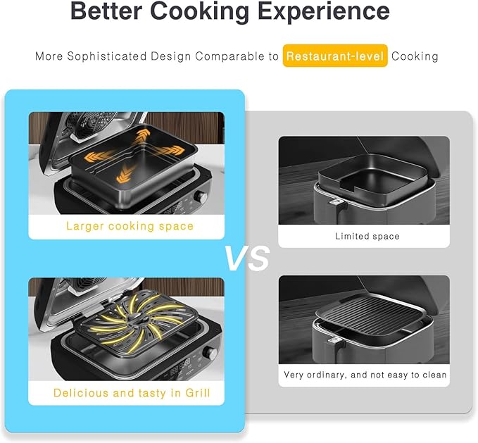 - Electric Grill & Air Fryer Oven with 7 Cooking Functions:This versatile electric indoor grill doubles as an air fryer, offering 7 built-in cooking functions easily selected with a turn of the dial. Reach up to 500°F and cook for up to 540 minutes — perfect for everything from juicy steaks to crispy veggies.