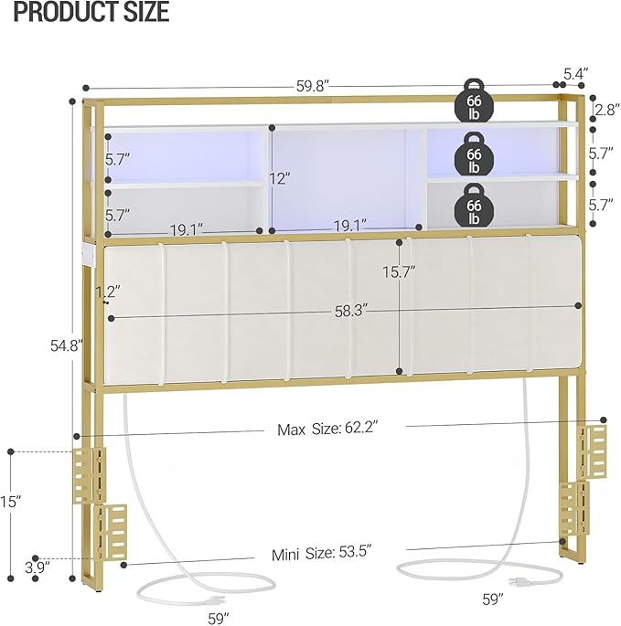 - Large Storage Space & Sturdy Structure: The headboard is made of selected particleboard and sturdy metal frame, without shaking or noise. And the top of the headboard is equipped with 3-tier adjustable storage space, which can hold books, phones, clocks or some personal belongings and each has a load-bearing capacity of 66 lbs. The height of the storage space can be adjusted up to 9.5 inches to meet various storage needs