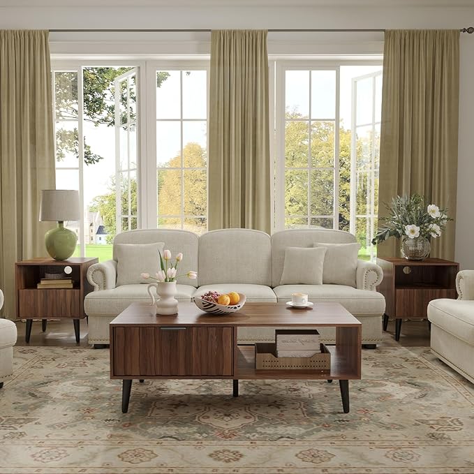 - 【Ample Storage Space】- Measuring 47.24''W x 23.62''D x 17.72''H, this rectangle retro coffee table is more than just a pretty face. It has 2 side drawers with high-quality metal glides for smooth operation, perfect for hiding your secret stash of snacks. The spacious open storage area allows easy access from any angle—no more awkward reaching