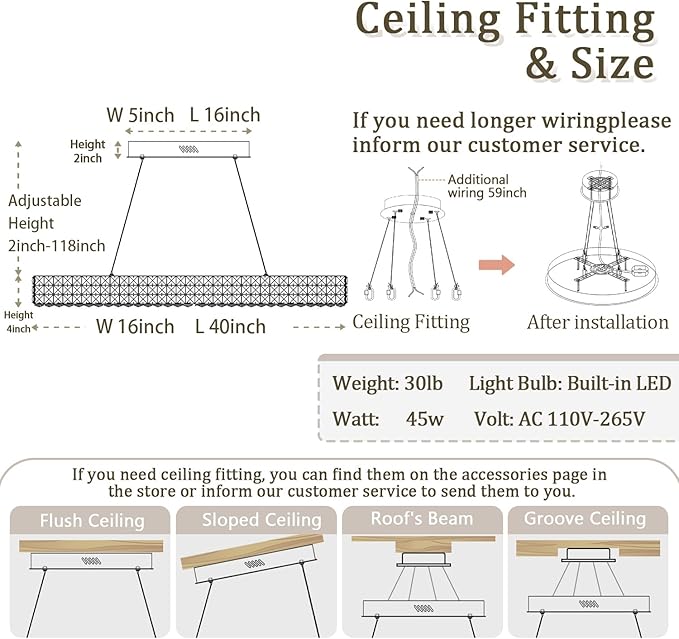 - 【Rectangular Pendant Light size】Dimensions: L40" x W16" x H4". The pendant cord is adjustable, with a maximum hanging height of 118". Its elegant design allows it to blend effortlessly into a variety of interior spaces, making it a striking focal point in living rooms, dining rooms, or entryways.