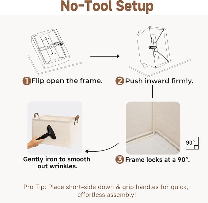 - Premium Quality: Made from high-quality fabric and reinforced with a heavy-duty MDF bottom board and a sturdy metal frame. The solid construction enables the storage bins to stand upright without support, even when empty.