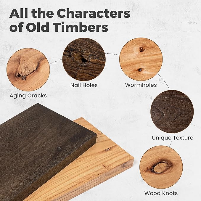 - RECLAIMED ELM WOOD SHELVES: Our wooden floating shelves are handcrafted from solid reclaimed elm wood, each floating shelf showcases the natural beauty of wood knots, grain, and texture. The reclaimed elm wood features knots, cracks and imperfections that tell a story of time and use. These shelves exude a rustic and aged appearance, adding charm and character to your home decor
