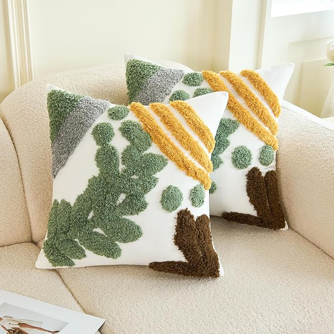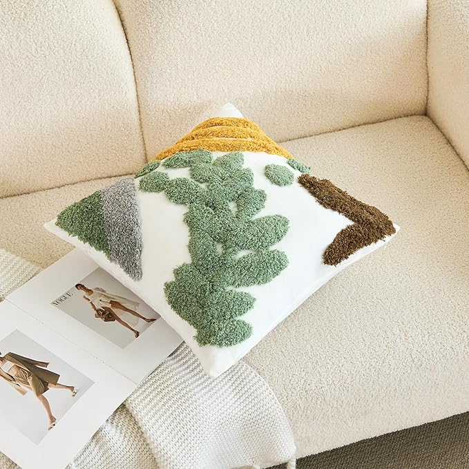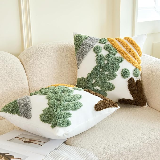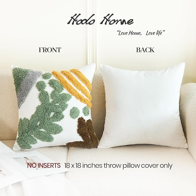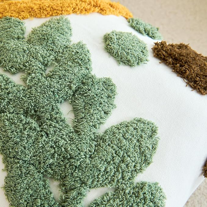 - ⭐【FABRIC AND SIZE】The front of this boho couch pillow cover is made of 100% polyester + 10% viscose,the backside is made of 100% cotton.Measures 18x18 inches.Exquisite workmanship enables tufting part dense soft and aesthetic.The 3D effect with the tufting technic makes these abstract pillow covers so distinctive